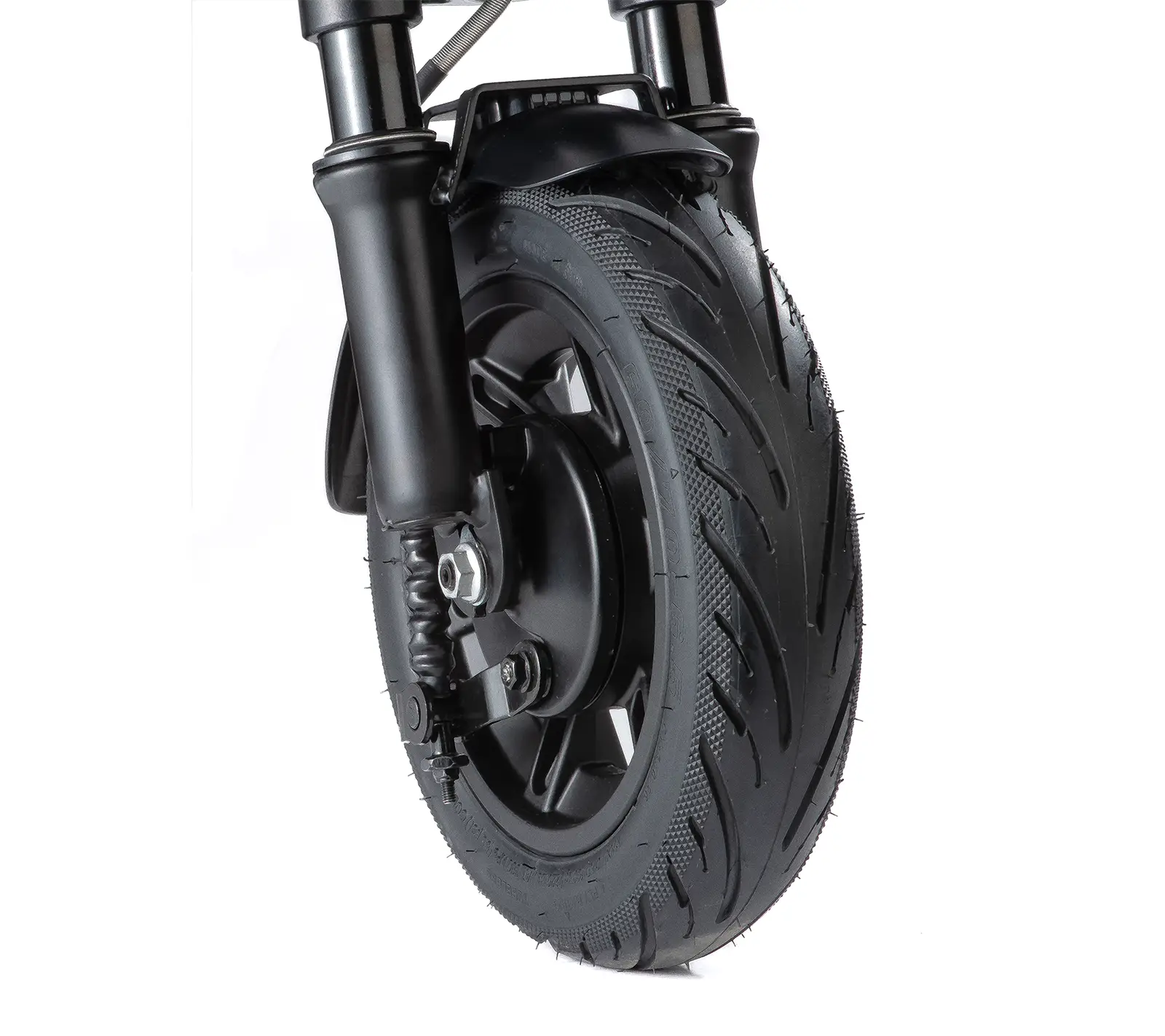 10 Zoll Luftreifen mit Geleinlage – Schlauchlose Reifen mit selbstreparierender Einlage: kleine Einstiche werden automatisch abgedichtet. Der Luftdruck kann an Fahrergewicht und Fahrstil angepasst werden.