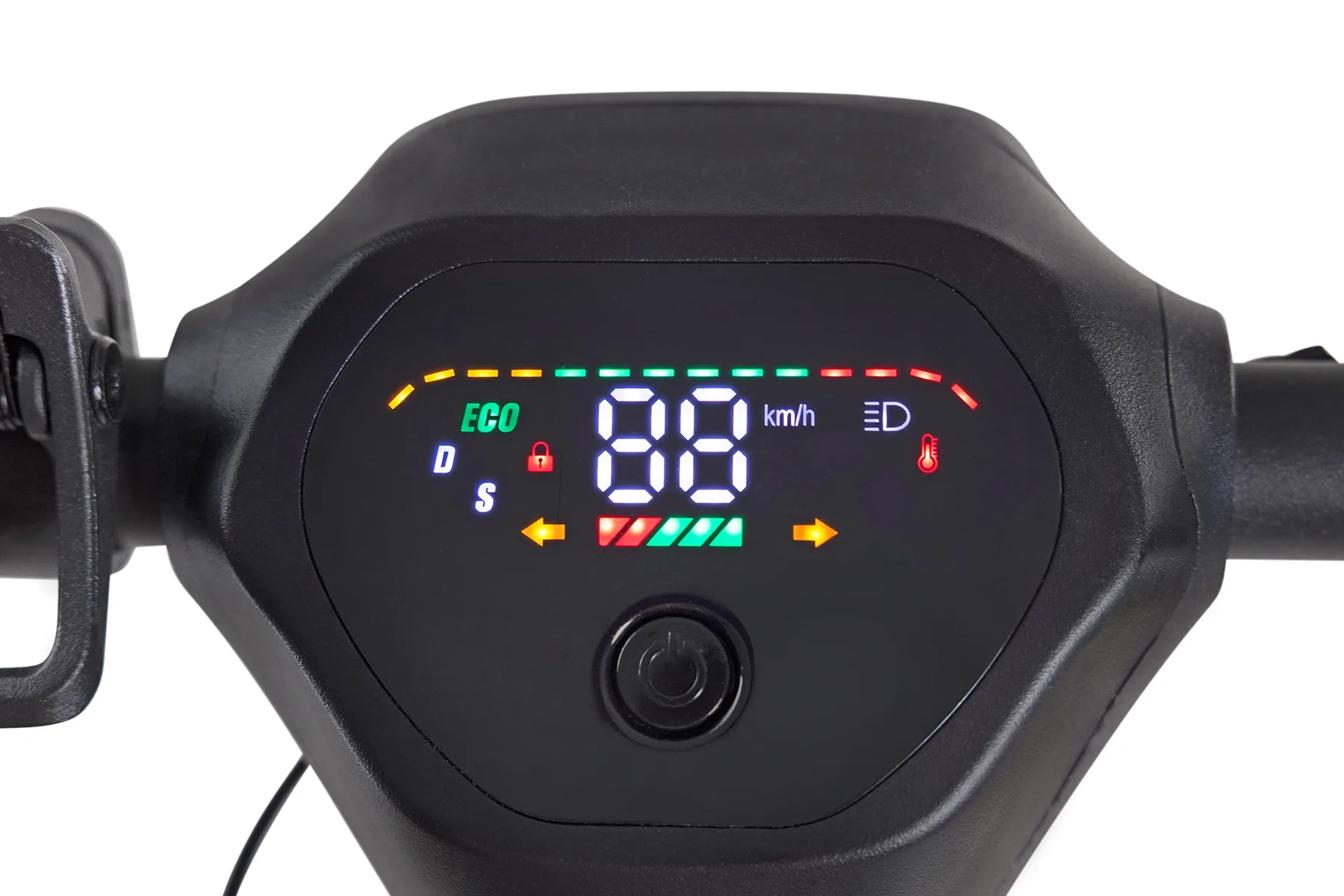- Fahrmodi: S (maximale Geschwindigkeit), D (15 km/h), Eco (5 km/h Schiebehilfe).