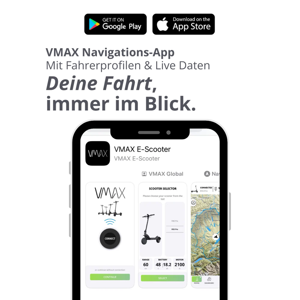 Über die VMAX Connect App lässt sich der Scooter koppeln, um Fahrdaten, Geschwindigkeit und Akkustatus bequem anzuzeigen.